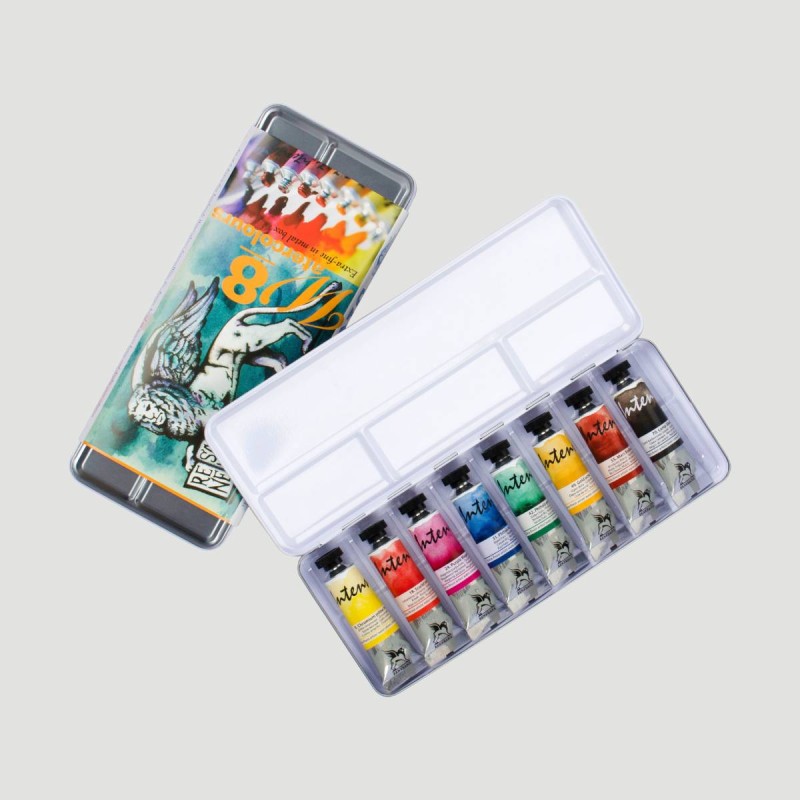 Set 8 Acquerelli Extra Fini Intense Water Renesans. Set da 8 tubetti da 15ml di Acquerelli Extra Fini Intense Water Renesans, realizzati con pigmenti puri, miele naturale e gomma arabica del Kordofan. Colori intensi, luminosi e professionali.