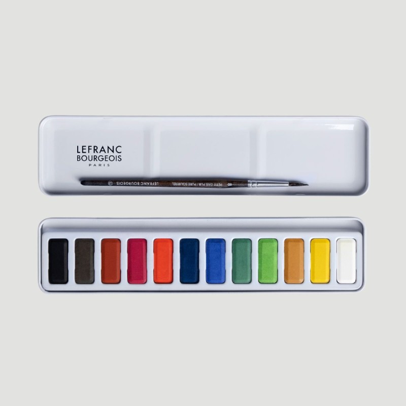 Set Acquerelli Studio Lefranc Bourgeois, 12 Godet! Il set contiene al suo interno 12 diversi colori di qualità studio e un pennello per acquerello misura 8. Il set è pensato per studenti e pittori amatoriali che vogliono sperimentare con gli acquerelli.