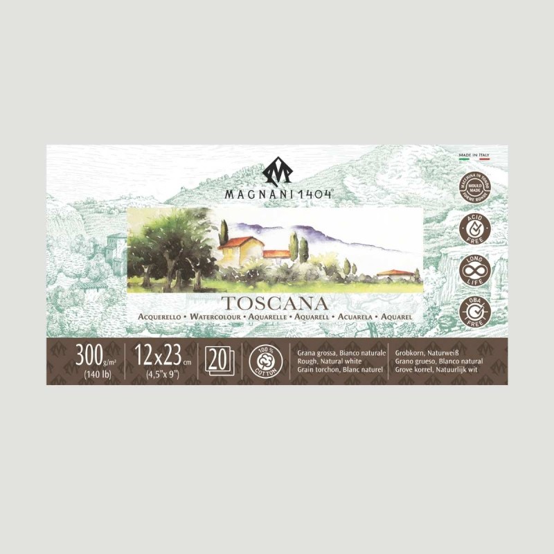 La carta Magnani viene prodotta in Italia e rappresenta un'eccellenza all'interno del mondo dei supporti per la pittura. I Blocchi Toscana vengono prodotti su forma in tondo, utilizzando feltri marcatori naturali di esclusivo disegno Magnani 1404. La composizione della carta è 100% cotone e la lavorazione avviene senza acidi e derivati del cloro, garantendo così resistenza all'ingiallimento causato dall'esposizione ai raggi UV. Nel caso dei Blocchi Toscana stiamo parlando di grana ruvida e grammatura di 300gr.