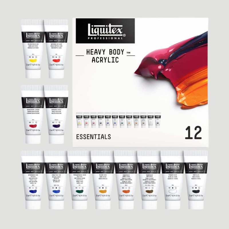 Set 12 Colori Acrilici Heavy Body Liquitex, tonalità essenziali formato 22ml.