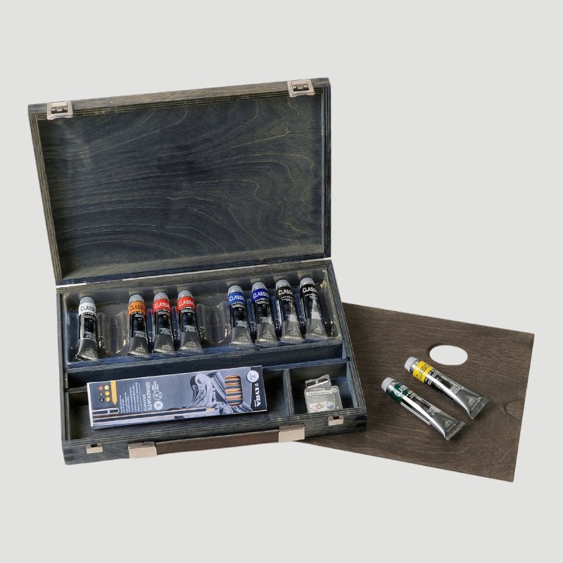 Cassetta in Legno Olio Classico Maimeri, 10 tubetti da 20ml. La scelta ideale per chi si avvicina alla pittura a olio. Contiene 10 tubetti da 20ml, un set graphite Lyra, una gomma pane e un temperamatite, il tutto racchiuso in un'elegante confezione, perfetta per iniziare con qualità e convenienza.