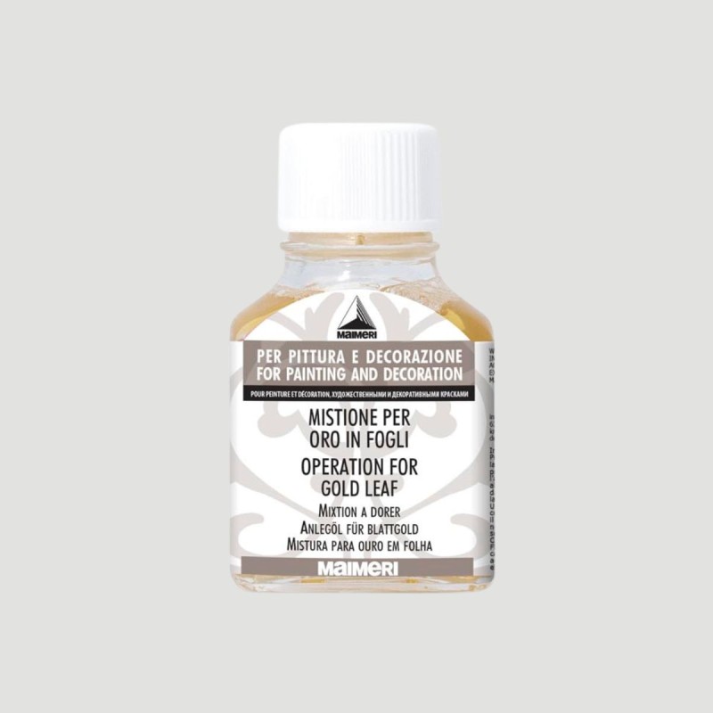 Mistione per Oro in Fogli Maimeri. Adesivo a base oleosa per l'applicazione di foglia oro. Ideale per tecniche tradizionali di doratura su diversi supporti.