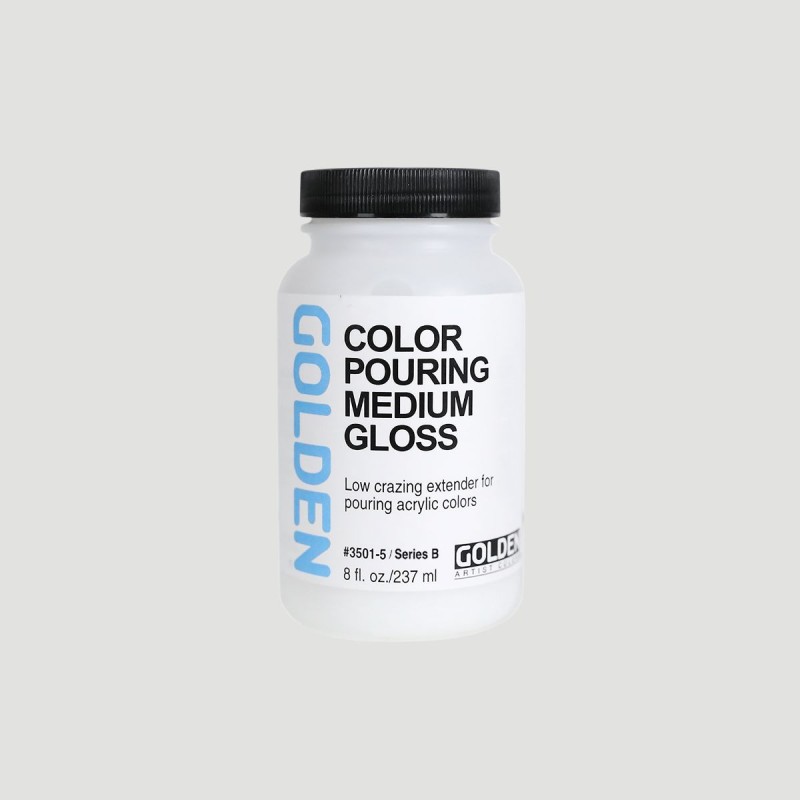 Color Pouring Medium Gloss di Golden è un medium 100% acrilico specificamente formulato per la tecnica del pouring. Aggiunto ai colori acrilici – come Heavy Body, High Flow e Fluid – consente di ottenere superfici lisce, lucide e prive di screpolature, mantenendo la brillantezza del colore anche dopo l’asciugatura.