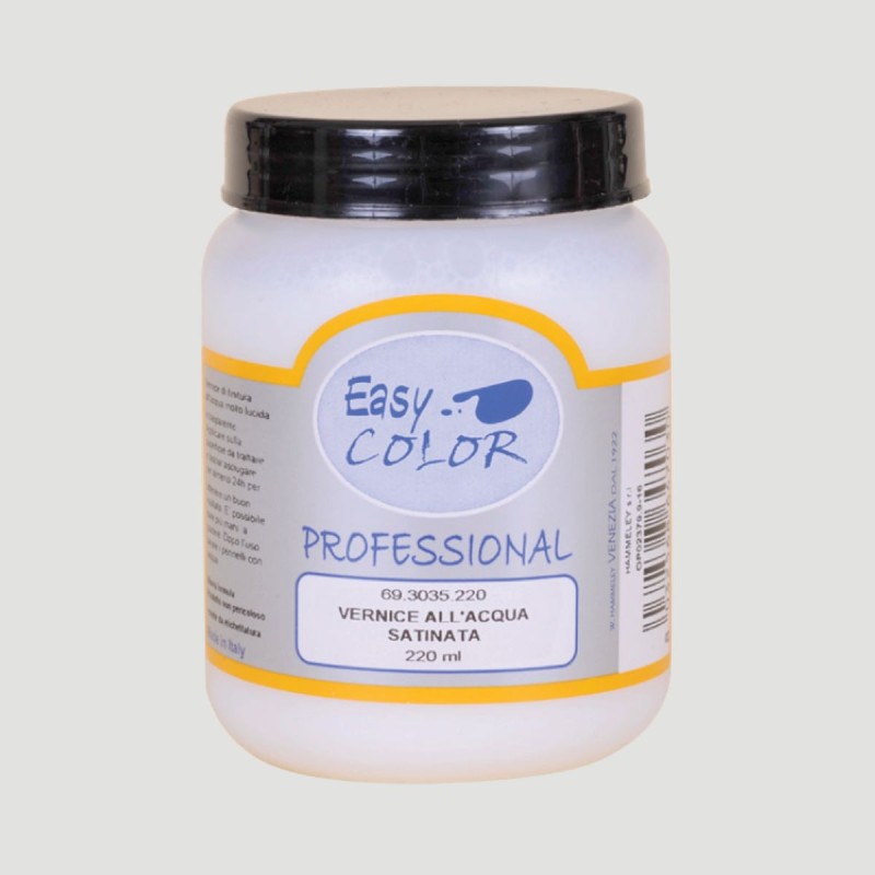 Vernice all'Acqua Satinata Easy. Finitura trasparente che protegge e intensifica i colori, donando un effetto tra il brillante e l'opaco.