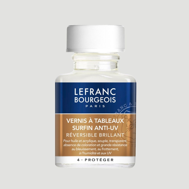 Vernice Finale Sopraffina Anti UV Lucida Lefranc Bourgeois, formato 75ml e 250ml. Proteggi e valorizza le tue opere a olio e acrilico con questa vernice extra-fine a finitura lucida. Applicabile al pennello, offre una copertura perfetta e duratura, proteggendo da polvere, graffi, scolorimento e raggi UV, e preservando ogni dettaglio del tuo lavoro artistico.